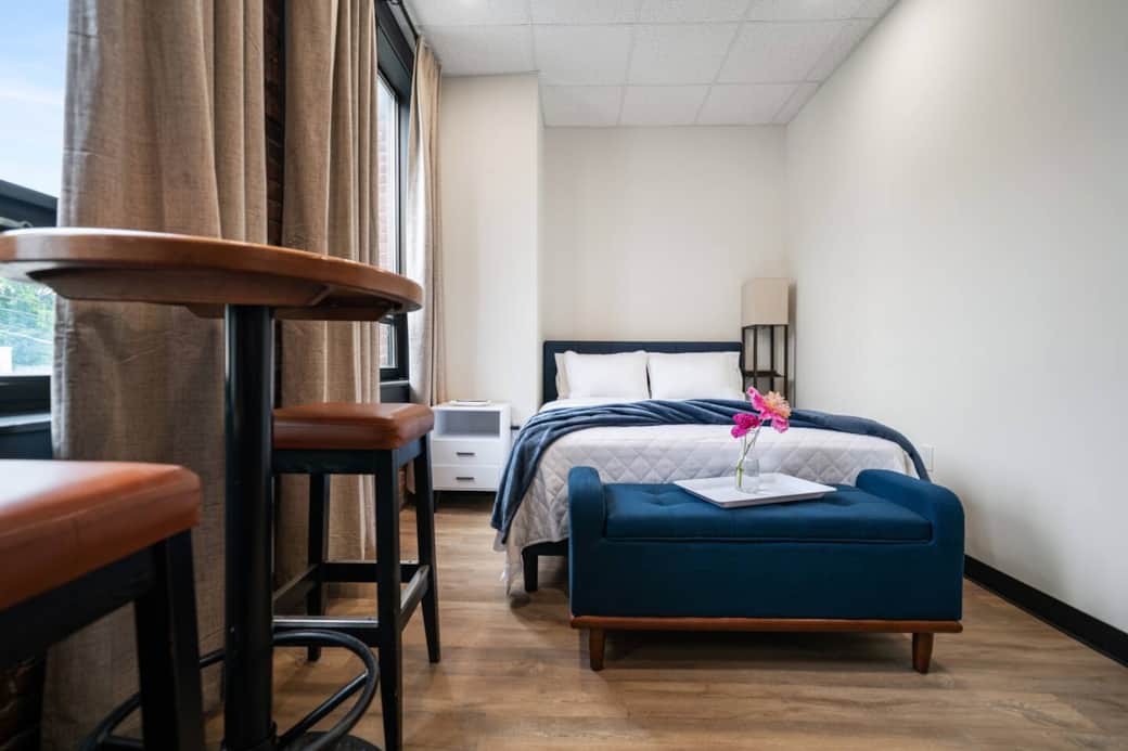 Located in a recently renovated historic building, this is our most efficient suite, designed for travelers who value simplicity without sacrificing comfort. It features a queen bed, a compact fully equipped kitchenette with a 4-burner cooktop, convection microwave, under-the-counter fridge, and sink, plus a small dining table with bar stools. The private bathroom is stocked with fresh towels, hand soap, body wash, shampoo, and conditioner. Blue accents throughout the room add a touch of personality and calm.