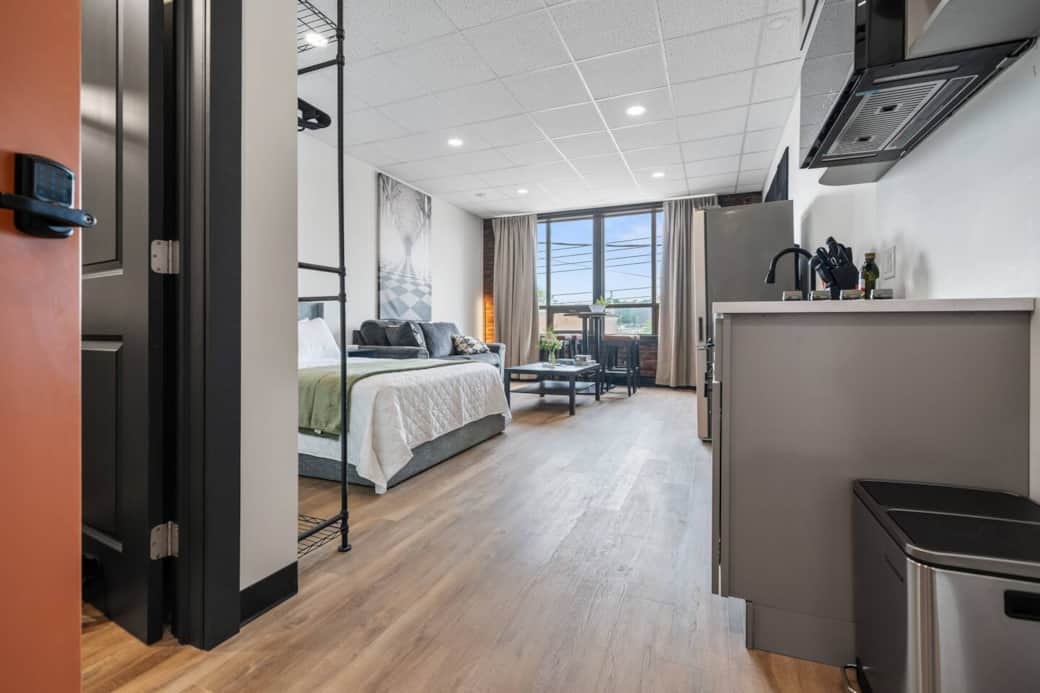 Located in a recently renovated historic building, this front-facing suite includes a queen bed and a pull-out couch, accommodating up to 2 extra guests. You'll find a fully equipped kitchen with a 4-burner cooktop, convection microwave, full-sized fridge, and sink, a dining area with bar stools, a 65" Smart TV, and a private bathroom stocked with fresh towels, hand soap, body wash, shampoo, and conditioner. Board games are available for guest use - perfect for a relaxed evening in.