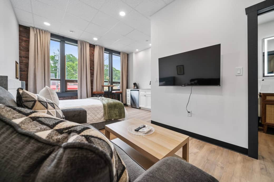 Welcome to The Classic @ The MillRows Suites! A bright, tastefully styled suite in the heart of downtown New Glasgow. With vintage prints and historic newspaper plaques on the walls, this space blends quiet charm with modern convenience. Enjoy a fully equipped kitchenette, 55" Smart TV, and cozy loveseat, all just steps from cafés, shops, and the waterfront. Ideal for solo travelers, couples, or business stays looking for comfort and character in a central location.